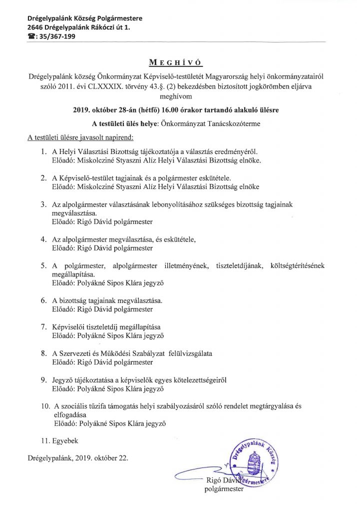 2019.10.28. - Drégelypalánk Község Önkormányzat Képviselő-testületének alakuló ülése