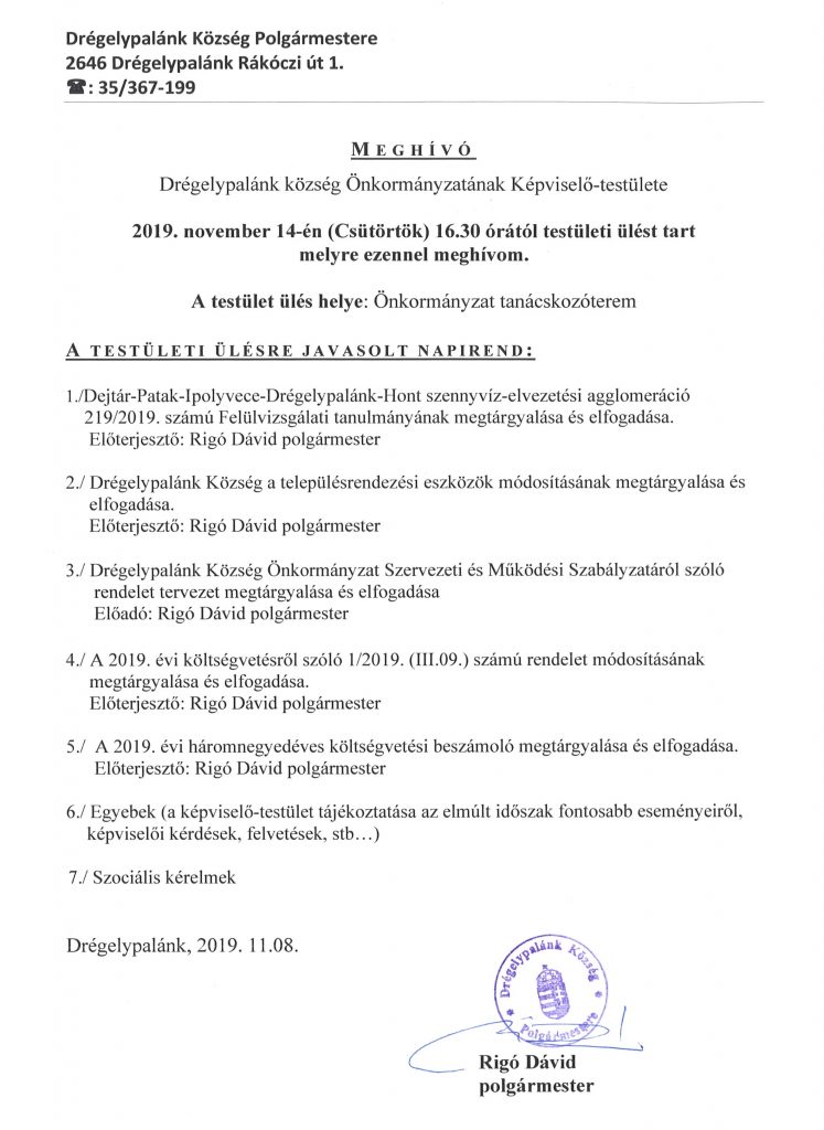 2019.11.14. - Drégelypalánk Község Önkormányzat Képviselő-testületének ülése
