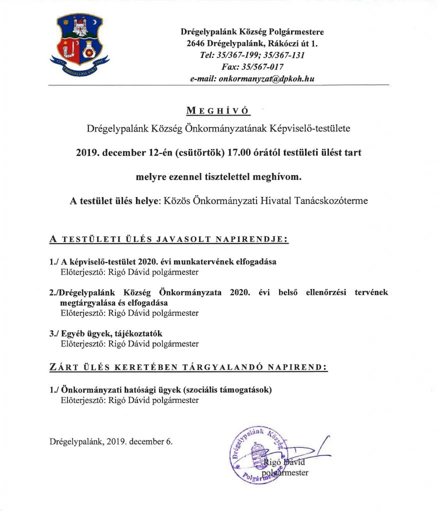 2019.12.12. - Drégelypalánk Község Önkormányzat Képviselő-testületének ülése