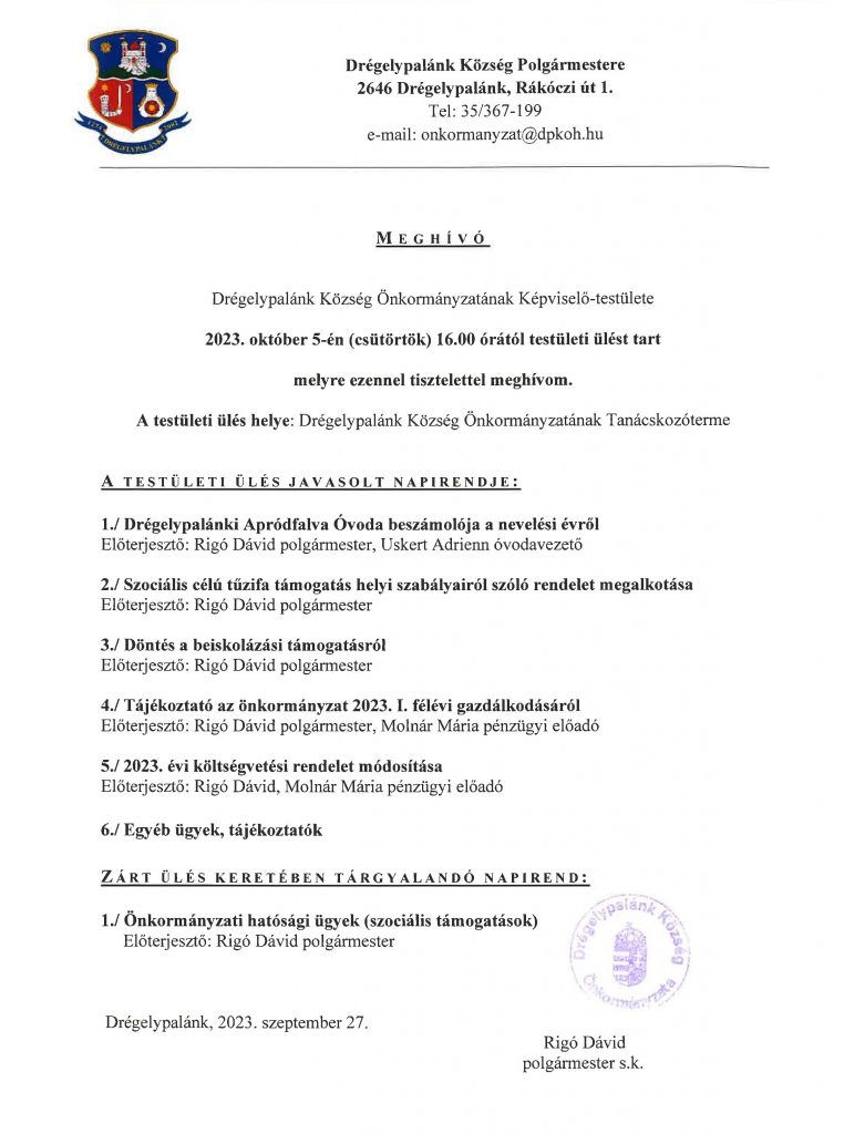 2023.10.05. - Drégelypalánk Község Önkormányzat